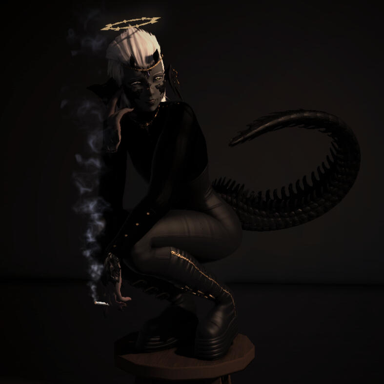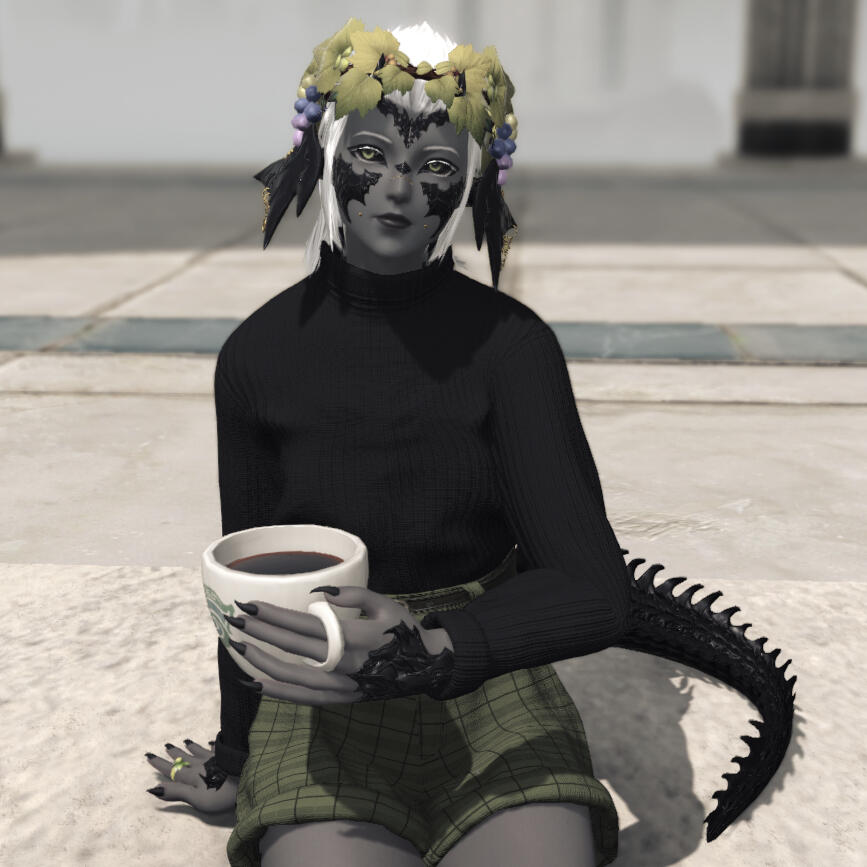 xaela au'ra · hotgo tribe · the azim steppe20s · she/they · soft butch lesbian4'8" short king · licorice scales · graphite skin · platinum hair · green-black eyes · thicc croc tailchainsmoker · needs heat lamp · crumbs in pockets3rd sun of the 3rd astral moon · nald'thalfrequently seen in ul'dah🔞