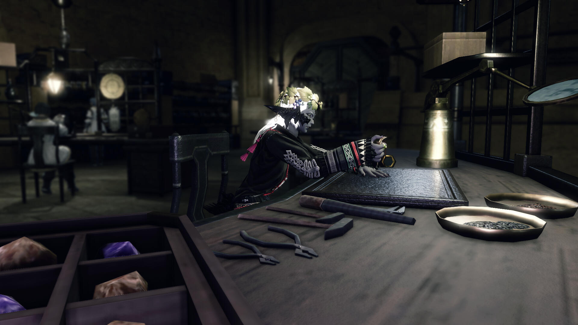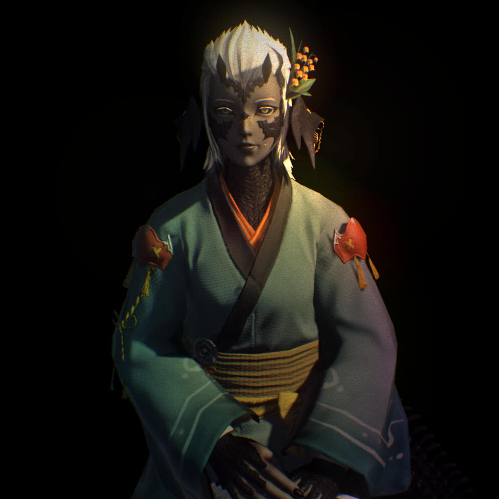 Born to Hotgo jewellery merchants Chabi + Ular in the Azim Steppe, Pürevdalai is the middle of 3 children; an older brother Khalja + younger sister Möge. Unlike her siblings she only inherited her mother's white hair instead of the signature Hotgo blue, though all 3 have green eyes, and grey skin of varying shades.Being Hotgo, legend says members of the tribe trace their origins to boy and girl from days of yore; both of whom appeared from the belly of a steel giant.Pürevdalai had a relatively comfortable and happy childhood. She had a very loving family, and never wanted of anything due to her parents' successful jewellery stall at the Reunion marketplace. Of both parents, Chabi would frequently embark on expeditions to source high quality metals and gems across Othard, and Ular would refine the raw materials and painstakingly handcraft the ornate adornments.Once old enough, Khalja loved taking over the running of the stall and catching up with the extended family who would always stop by. He was also frequently having to protect the merchandise from Pürevdalai draping them over her horns and tail, much to the amusement of any onlookers. It was with her family that she gained a love for gilded adornments.Their younger sister Möge expressed no interest in the family business, but instead spent most of her time catching little critters in the grass and pressing flowers in any book that she could get her little hands on. On more than one occasion, said book would be her parents' business ledger.In recent years, the Hotgo were massacred at the hands of the Dotharl. There are but few survivors, all of whom were away at the time. Pürevdalai, her brother Khalja, and their maternal grandmother Börte were the only members of her family to survive. Börte was fortunate - some would say unfortunate - enough to be spared as she was of Dotharl descent. Pürevdalai and Khalja happened to be visiting Kugane at the time, but sadly their younger sister (9 summers old), parents, and 3 other grandparents were not so lucky.Upon returning to the Steppe and finding all but their grandmother massacred, Khalja wished to stay with their grandmother; but since Pürevdalai always yearned to explore the world at large, she took advantage of the situation and bought passage on the next ship leaving the Kugane trade port that was headed somewhere, anywhere, far away from Othard. That ship happened to be headed for Limsa Lominsa docks.Once arriving at Limsa docks, a Lalafell at customs was struggling with her name and ended up writing down "Piccalilli" because her name sounded like the condiment, and it stuck. Eventually that was whittled down to "Pickle", which is what everybody - including her living family - calls her to this day. At Limsa she eventually found work as a fishmonger for the Fishermans' guild, then later joining the guild itself to learn the angler's art. It wasn't much, but it was honest work for enough gil to cover living expenses. Many months later Pickle enrolled at the Arcanist's guild given her lifelong interest in all things arcane, and once adept enough to protect herself she ventured unto Ul'dah which has since become her home from home.Not too long after arriving in Ul'dah, Pickle overheard a conversation at The Quicksand about the Goldsmiths' guild. Suffice to say she immediately went to enrol, wanting to continue her family's legacy. She even now supplies various merchants at the Sapphire Avenue Exchange with her crafts, and it was during one of these transactions that she met her ex-wife; Billie Aspergilli.
